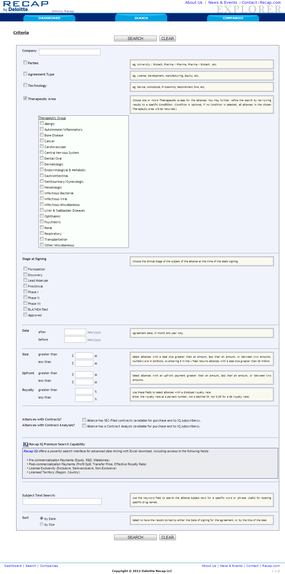 Deloitte & Touche's Life Science's division "watered down" Biotechnology and Pharmaceutical database website. Using a simpler search architecture and data presentation. This site is for clients who do not need the more powerful Recap IQ by Deloitte website.